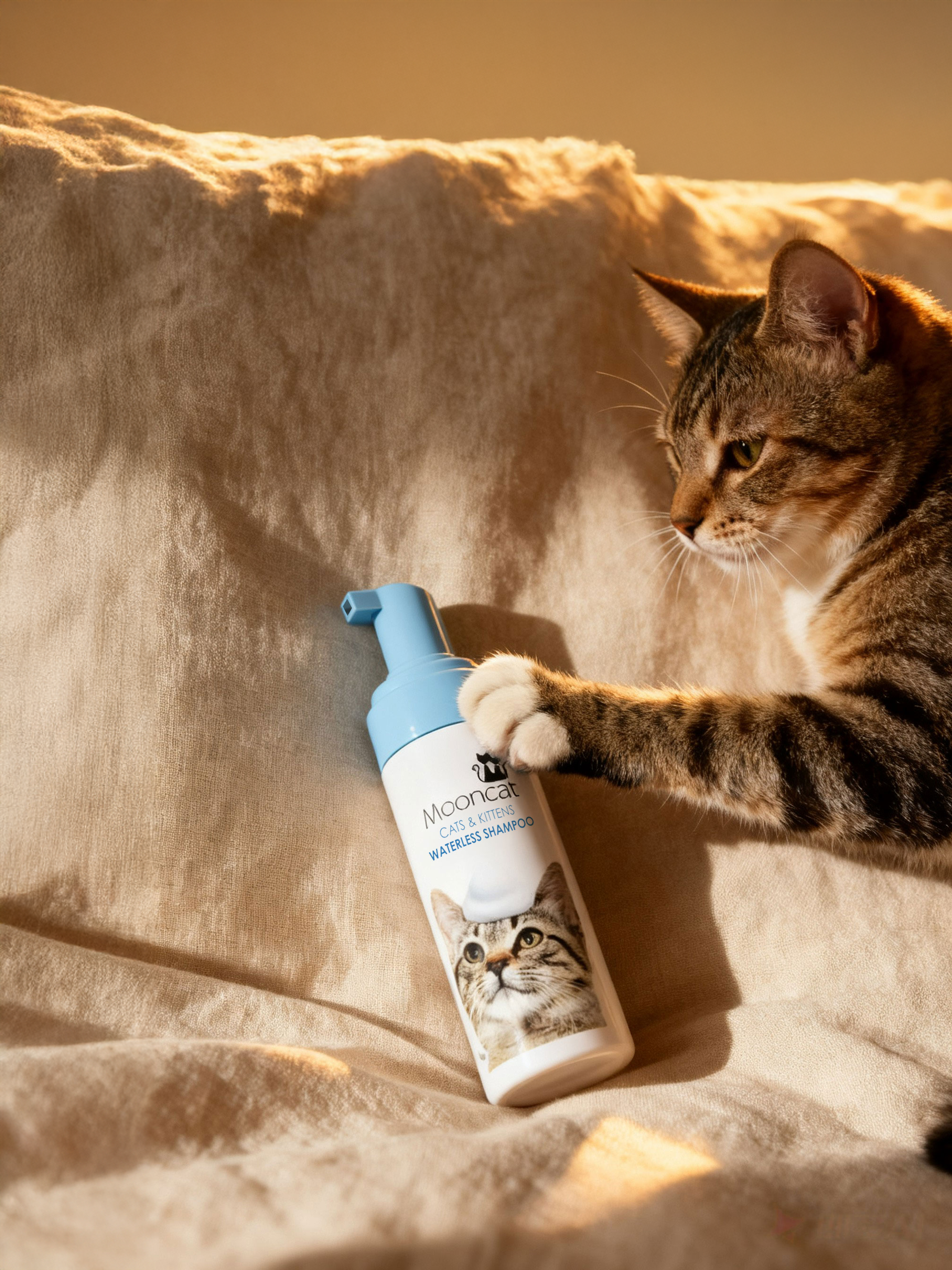 Yes, Mooncat Waterless Cat Shampoo uses food-grade, non-toxic ingredients, so it is safe if your cat licks it during grooming.