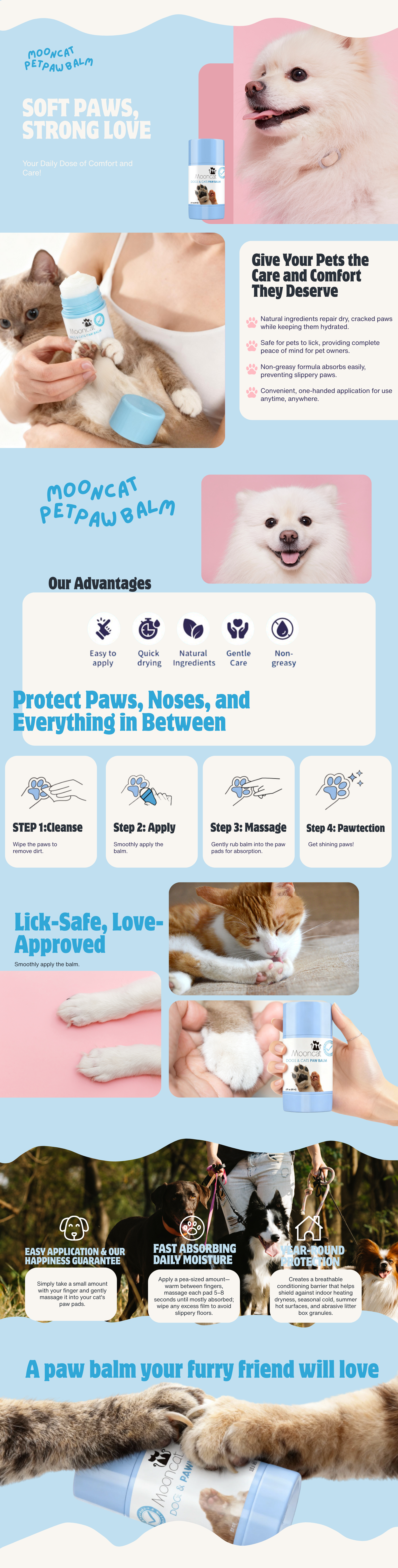 Mooncat Paw Balm is suitable for both cats and dogs of all ages, especially those with dry, cracked, or sensitive paw pads. Consult your veterinarian before using on open wounds.
