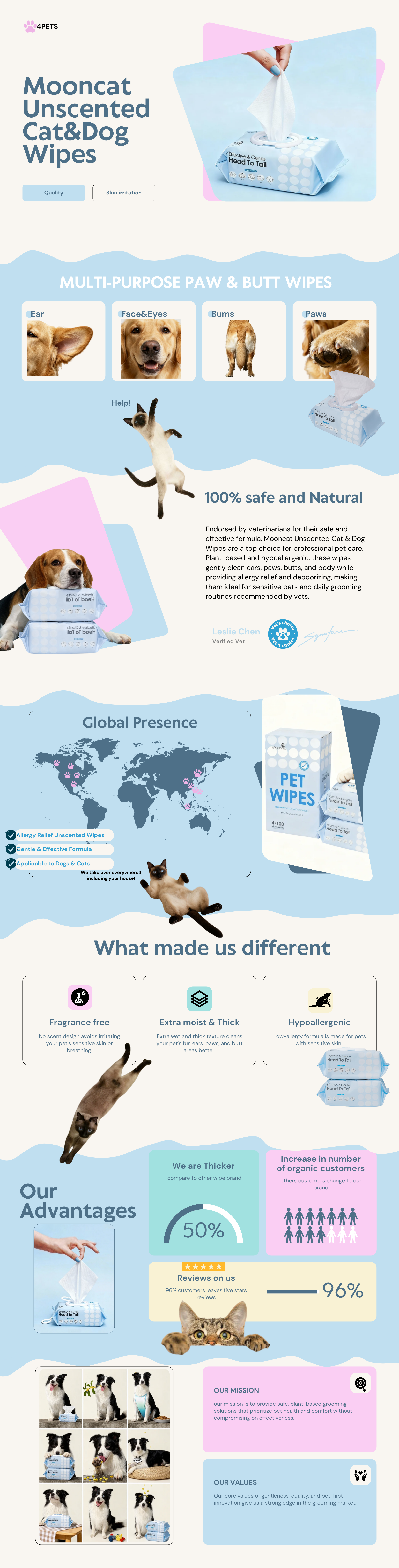 These unscented, hypoallergenic, plant-based wipes are designed for gentle, everyday cleaning from eye area to paws, using a thick, soft material and a high percentage of purified water to lift dirt without irritating the skin. The formula is free from harsh ingredients such as alcohol and parabens, helping support sensitive skin while minimizing redness, itching, and allergy risk for both cats and dogs.